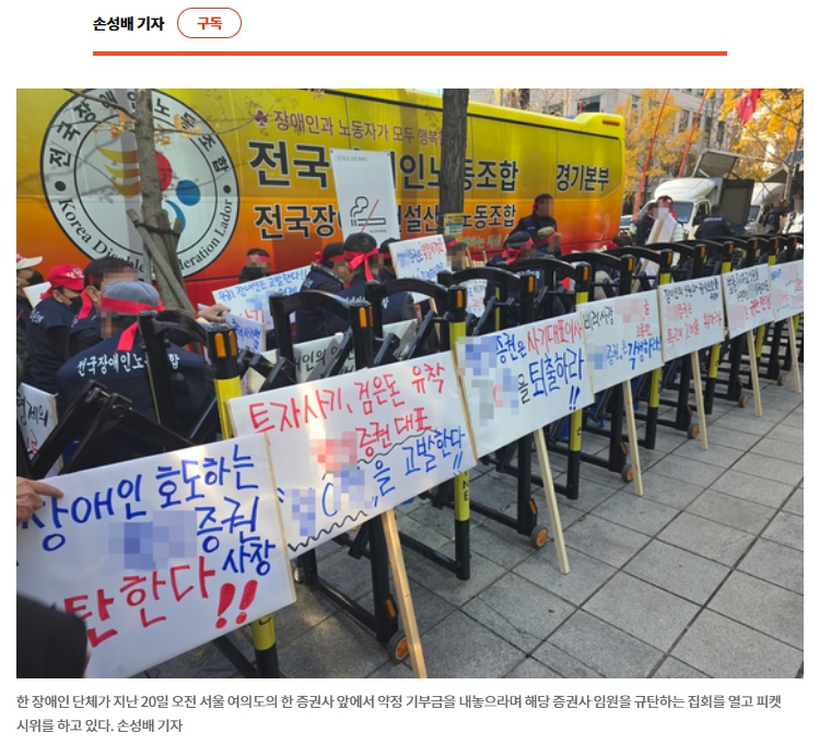 [중앙일보] "기부금 책임져" 장애인단체, 증권사 앞서 집회하는 사연