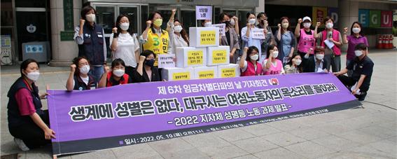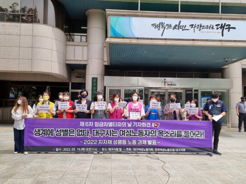 [연대활동] 제6차 임금차별타파의 날 기자회견 <생계에 성별은 없다. 대구시는 여성노동자의 목소리를 들어라!> 일시: 22.05.19(목) 11:00 장소: 대구시청 앞 주최: 대구여성노동자회, 전국여성노동조합 대구지부 |